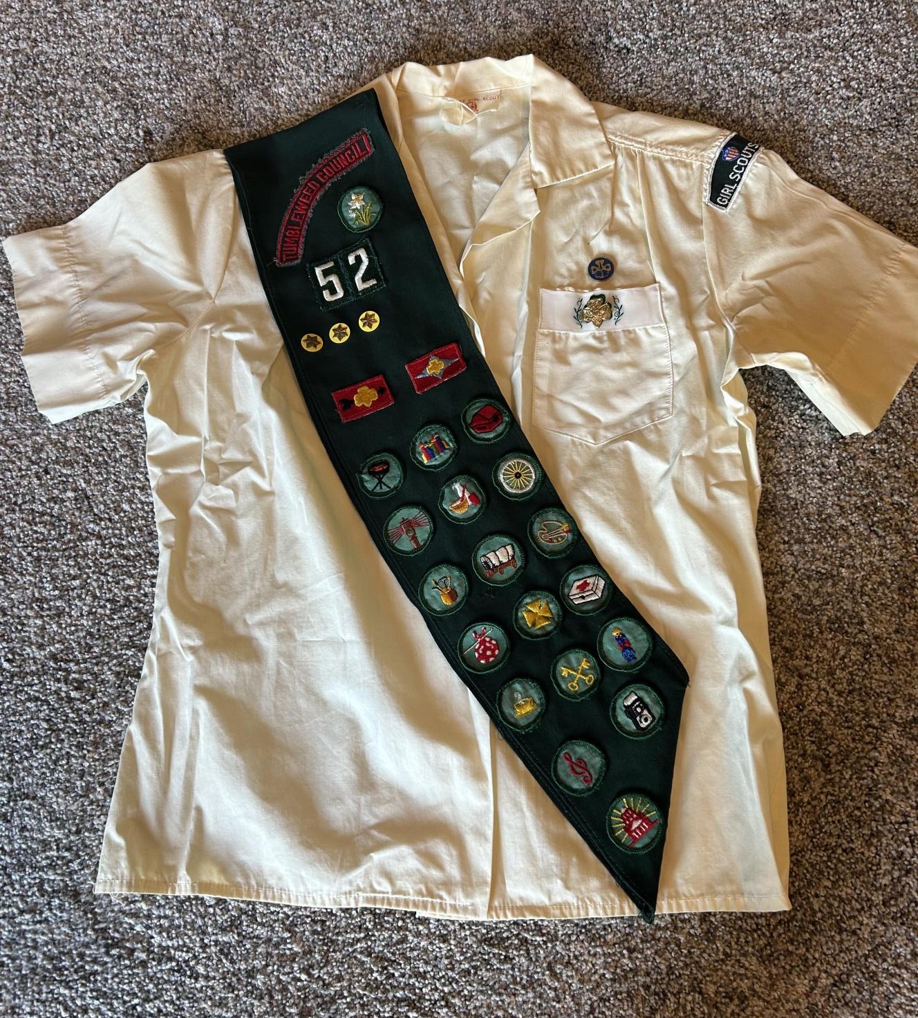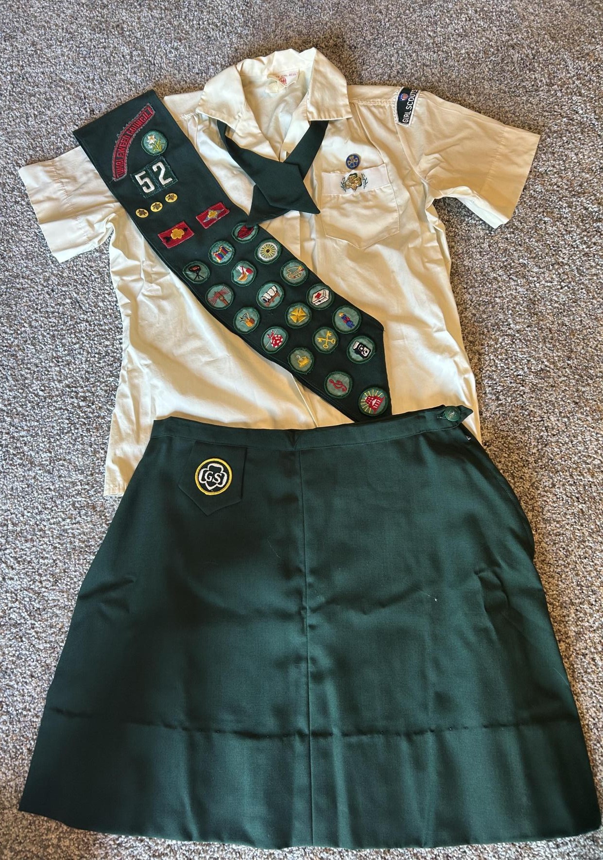 The adult Girl Scout uniform belonged to Dorothy Trenkamp, and the other uniform belonged to her daughter. Dorothy sewed the uniforms, and badges onto the sashes herself.